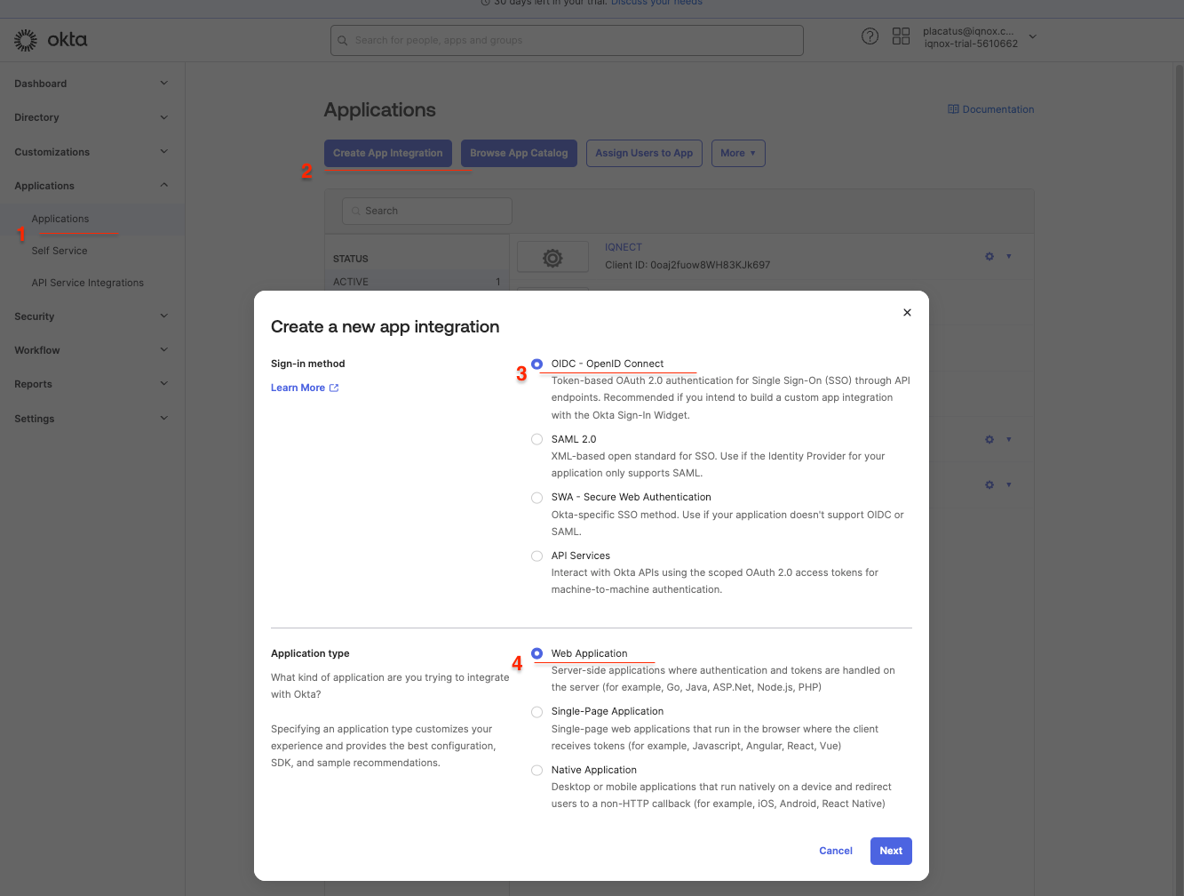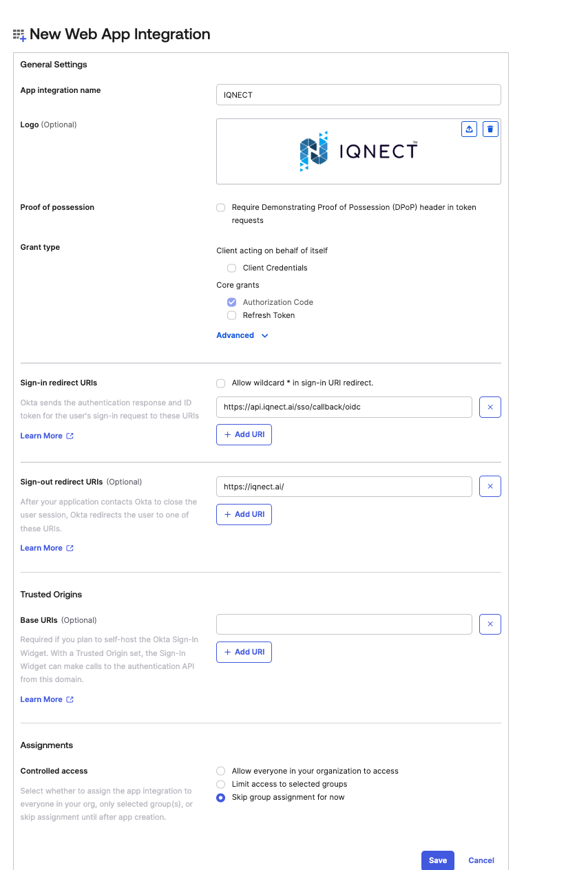 If your organization uses Okta Identity Provider (IdP) for user authentication, you can configure IQNECT to allow your users to log in using their IdP credentials. Note that both OIDC and SAML 2.0 protocols are supported when using OKTA as an IdP. This page is specific to OIDC. For SAML 2.0, go to Okta SAML.