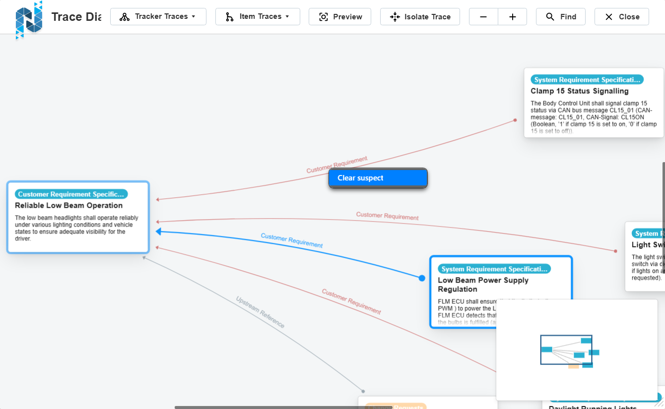 Regular traces are represented by dark gray arrows, and suspected traces are represented by red arrows. In the Explore Traces view, users can right-click on a suspected trace and clear its suspected state.