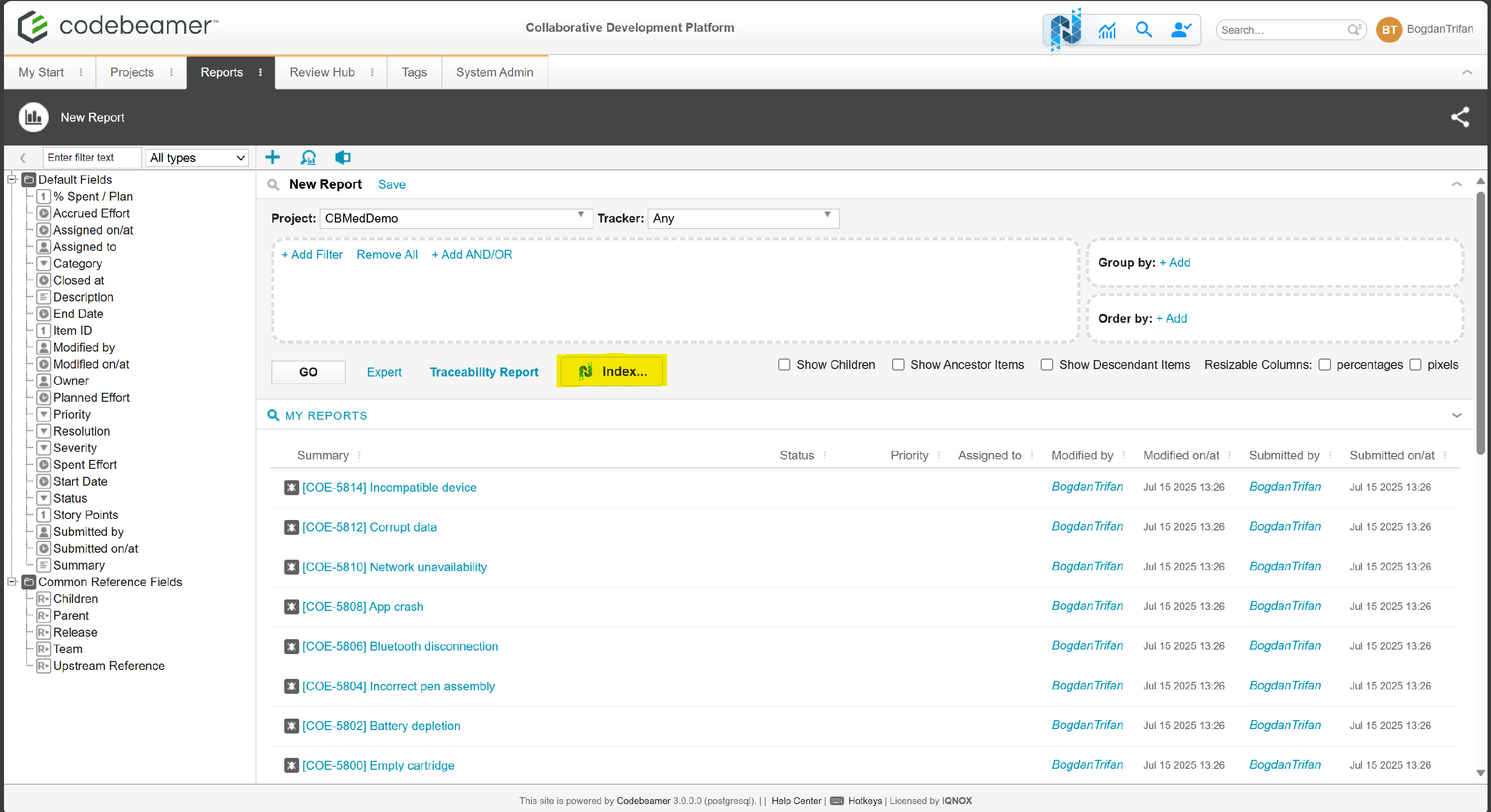 The Indexing UI feature provides users with Administrator privileges to initialize indexing from the Codebeamer Reports page. The user creates a cbQL string that can be re-used by the new Indexing UI to invoke re/indexing.