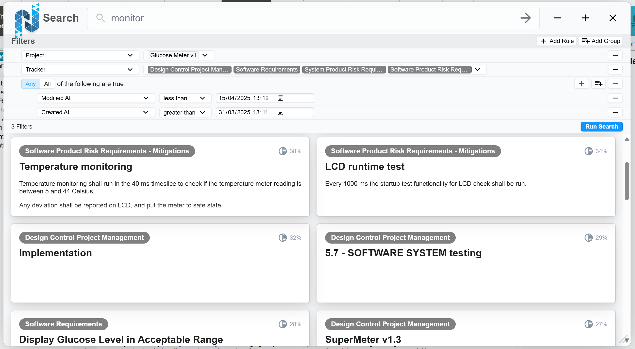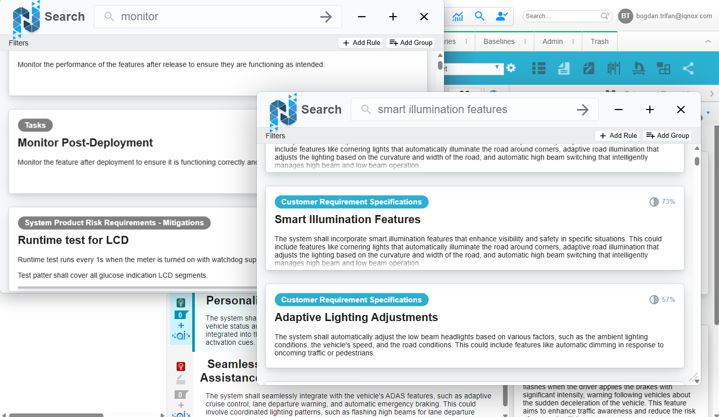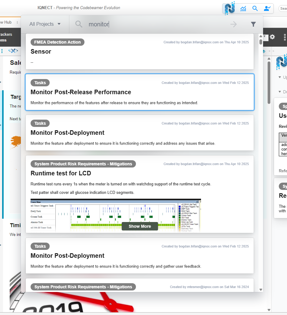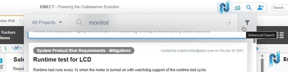 Semantic search helps you quickly find items by searching for related words. Unlike typical searches, it locates items with meanings similar to your query rather than exact text matches. To activate global search, click the magnifying glass icon available at the top of all Codebeamer views. For even faster access, use the Alt + Space keyboard shortcut from anywhere: