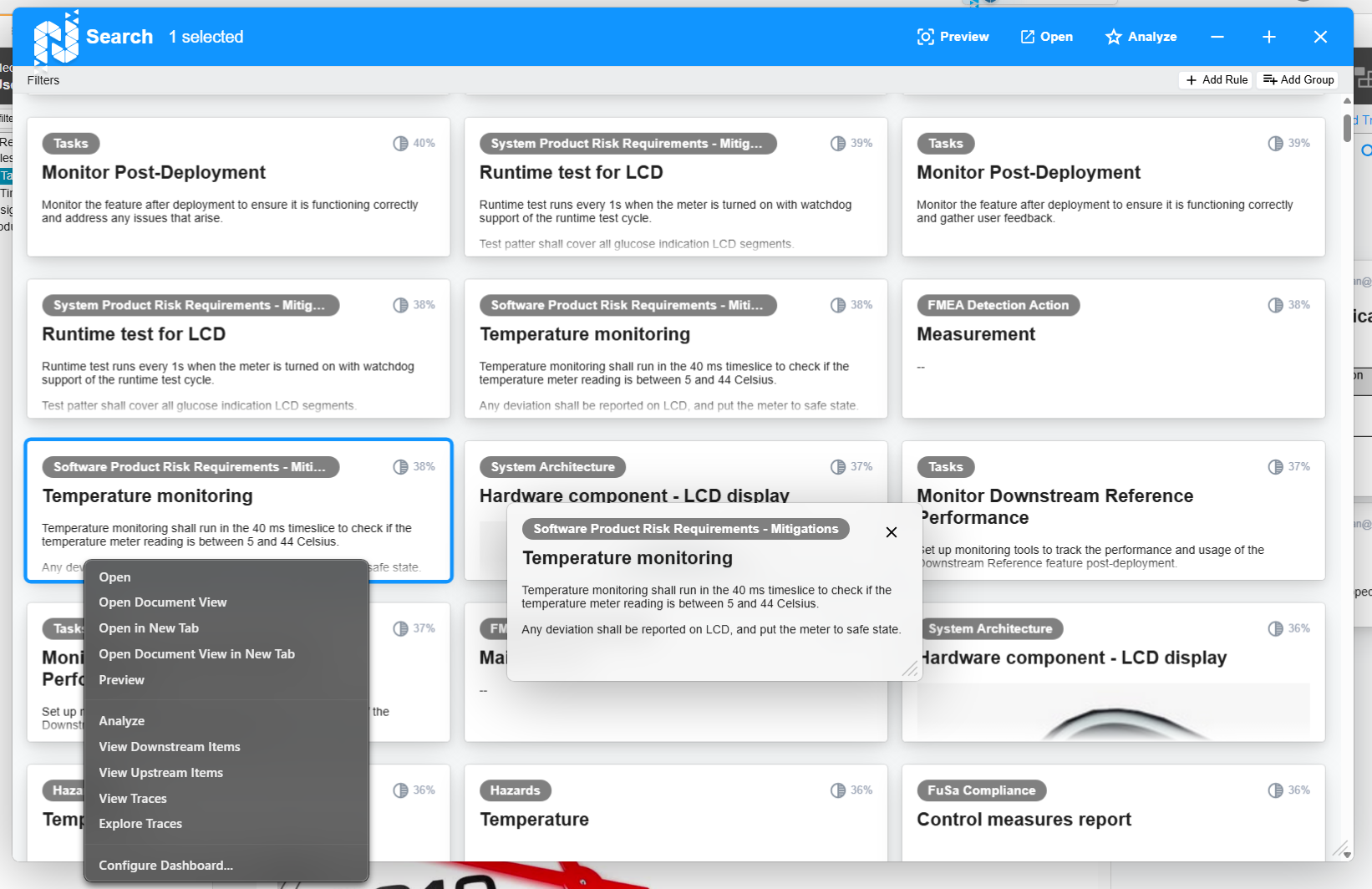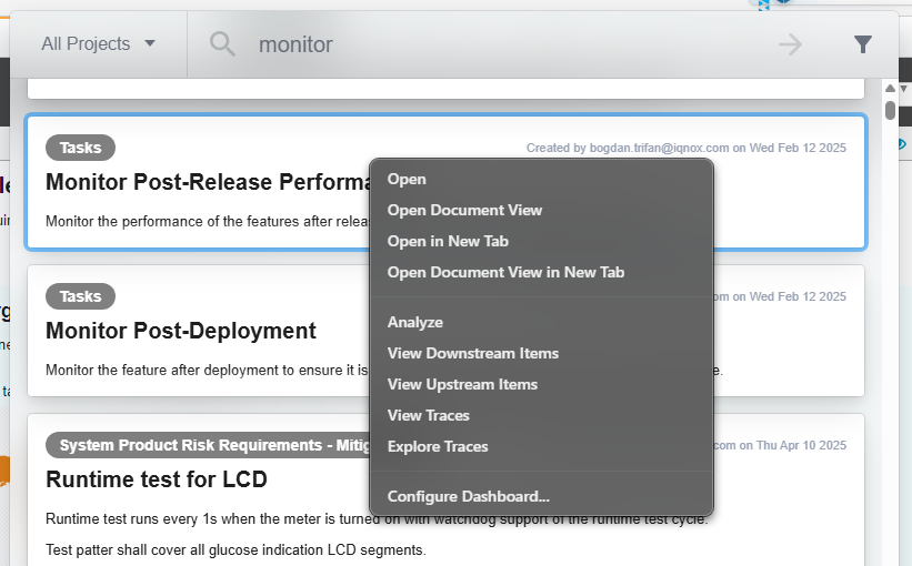Once the results load, you have several navigation options. Quickly press Enter to view the issue for the first result. Use the arrow keys to navigate through the items, or click on any result to open it. For more options, right-click or press Alt + Enter. This opens a menu where you can choose to open the result in document view or a separate tab, analyze the item, or view its downstream or upstream items.