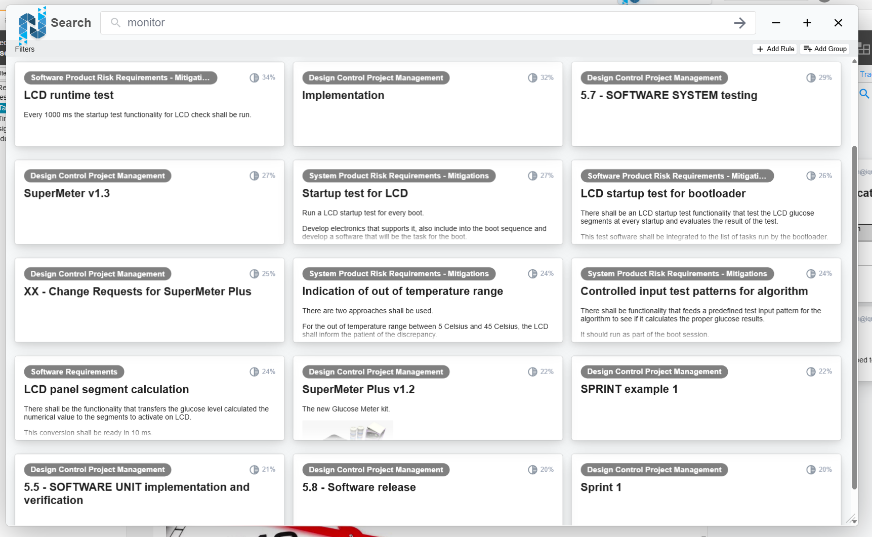 When the Advanced Search is invoked from an existing Semantic Search, the previous results transfer over to the Advanced Search window. A relevance score is displayed in each item card.